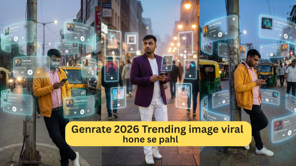 A Subject: me (use uploaded face 100% facial accuracy, no changes). with no extra brightness on the face, keeping my natural dark facial tone intact. dreamlike, movie-quality augmented reality visual where numerous hovering Spotify player interface cards orbit the central figure (the person shown), I am leaning a street light lamp on street, holding a phone and looking at phone in a complete 3D spatial composition, with each music player card strategically placed at varying distances, some prominently positioned in front and partially covering the subject, while others float behind and alongside them, utilizing the authentic Apple Music UI/Spotify Ul elements playback progress indicators and featuring songs by [Artist Name]; all cards display smooth rounded edges with subtle angular perspective shifts, presenting a translucent, frosted-glass aesthetic that radiates a gentle diffused border luminescence with measured cinematic light bloom interacting organically with the ambient lighting of the scene; the composition showcases a cool-to-neutral color palette with rich yet preserved shadow detail, strategic bursts of color from album artwork, medium-high contrast levels with gradual highlight transitions, delicate focal depth variation where nearer cards maintain crisp detail while farther ones receive gentle blur treatment, and understated motion-enhancing accents, all while keeping the subject photorealistic, centrally positioned, and authentically integrated into their physical surroundings. wear open yellow hoodie and black jeans, white sneakers, realistic Indian street background.